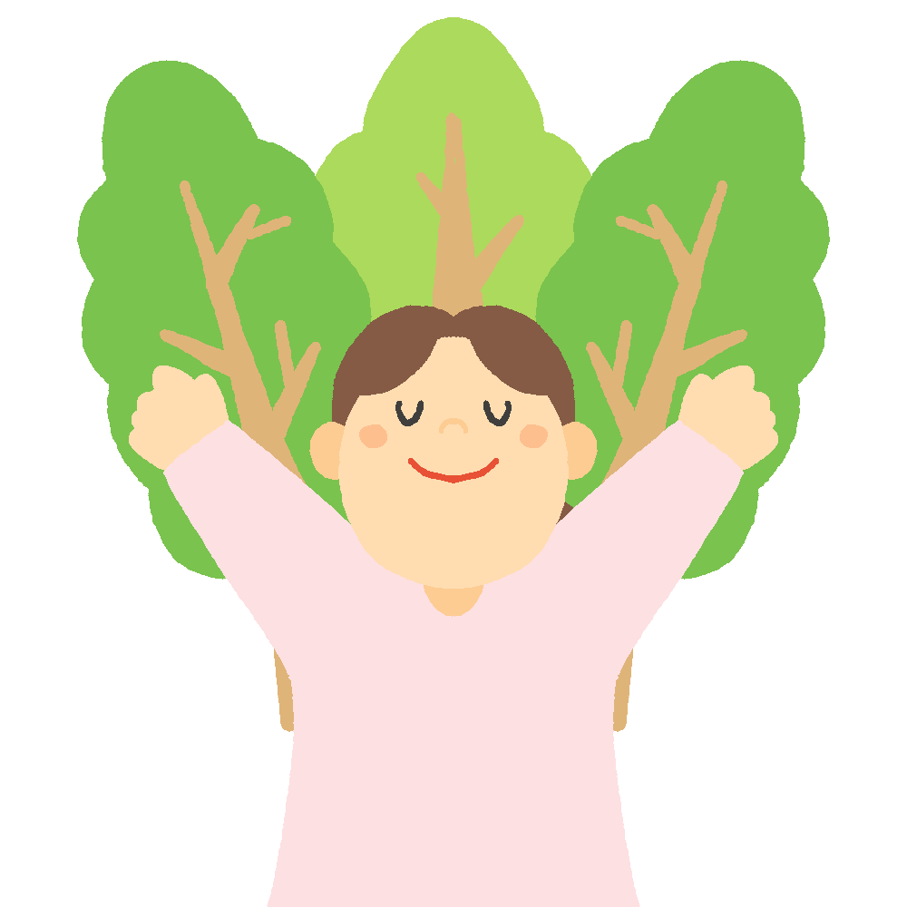 森林浴で深呼吸をする女性の無料イラストです。マイナスイオンのイラストなどにもどうぞ。
