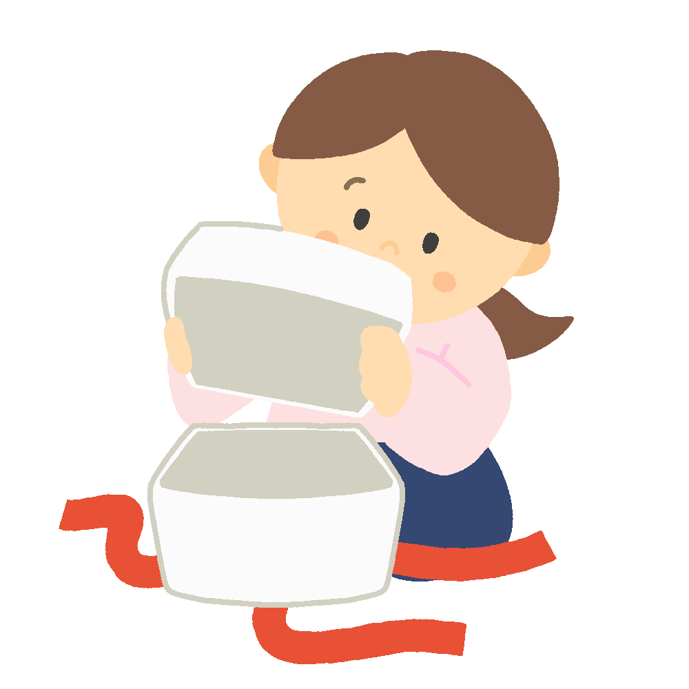 リボンを開けてプレゼントが入った箱を開ける女性の無料イラストです。