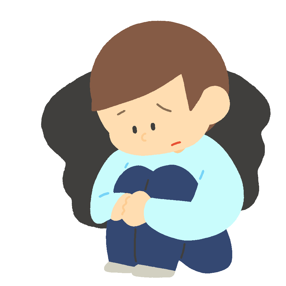 膝を抱えて落ち込んでいる男性の無料イラストです。ひきこもりのイラストなどにも。