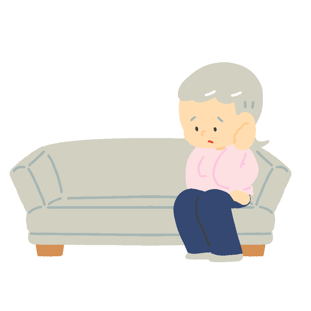 ソファに座って困った顔をしているおばあさんの無料イラストです。
