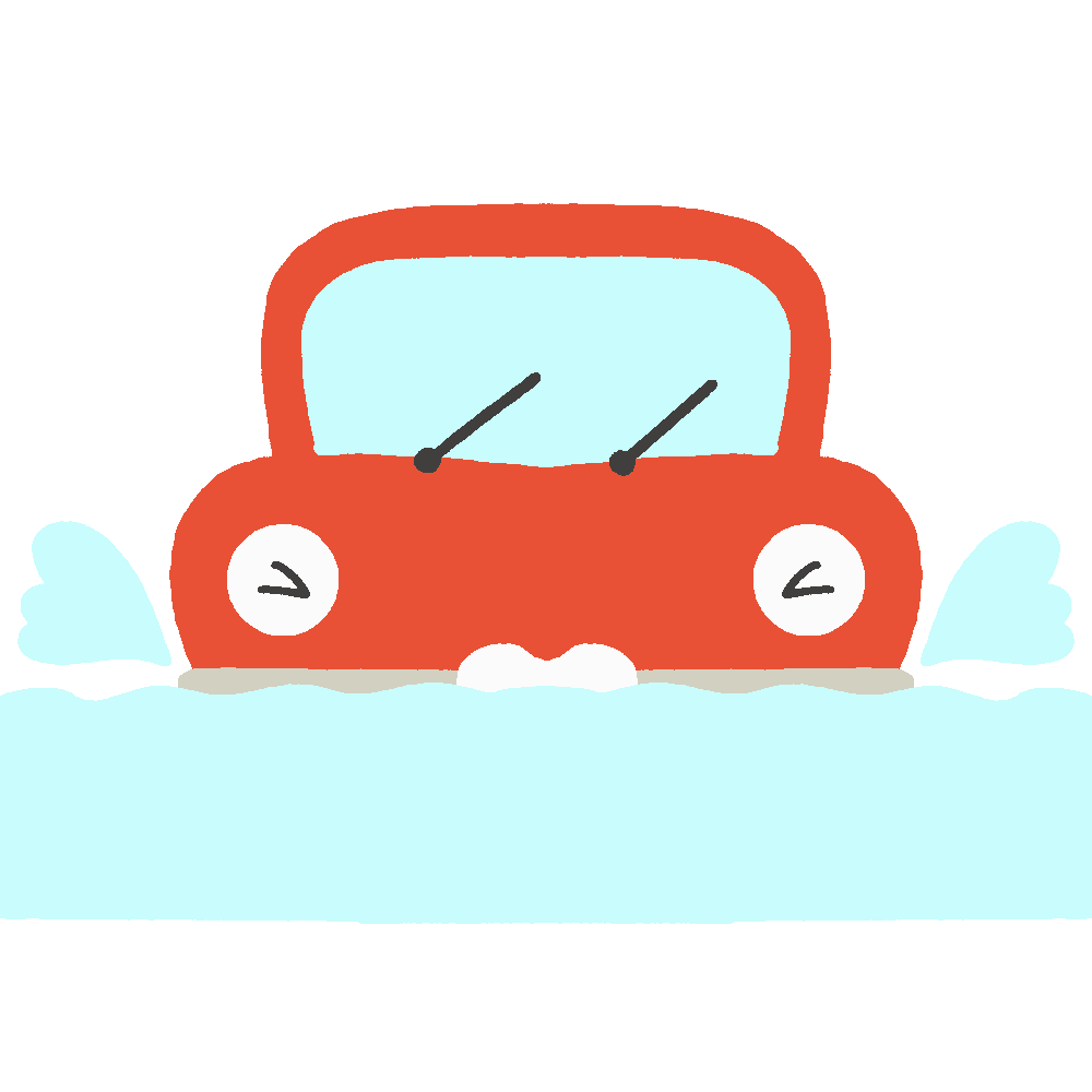 大雨で冠水してしまった道路を走っている自動車のキャラクターの無料イラストです。