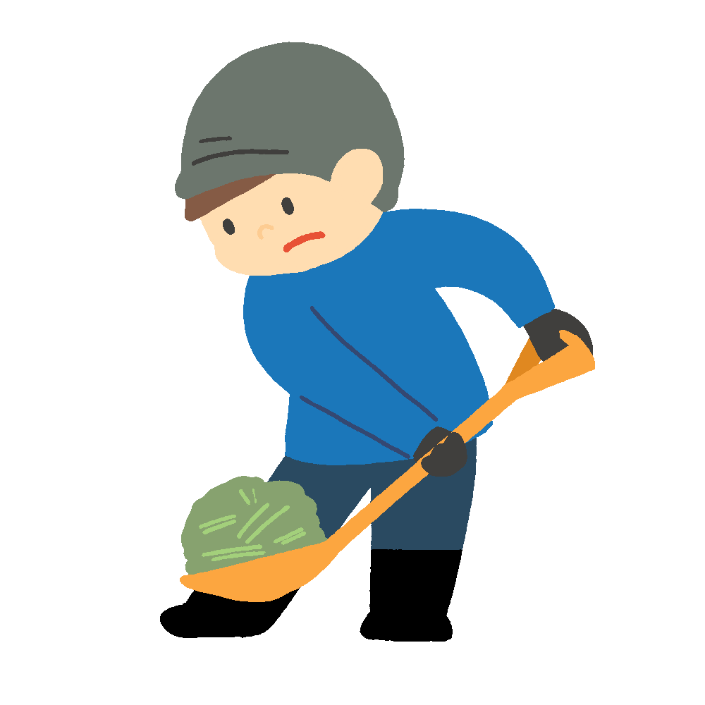 スコップで飼料をすくって運んでいる男性のイラスト