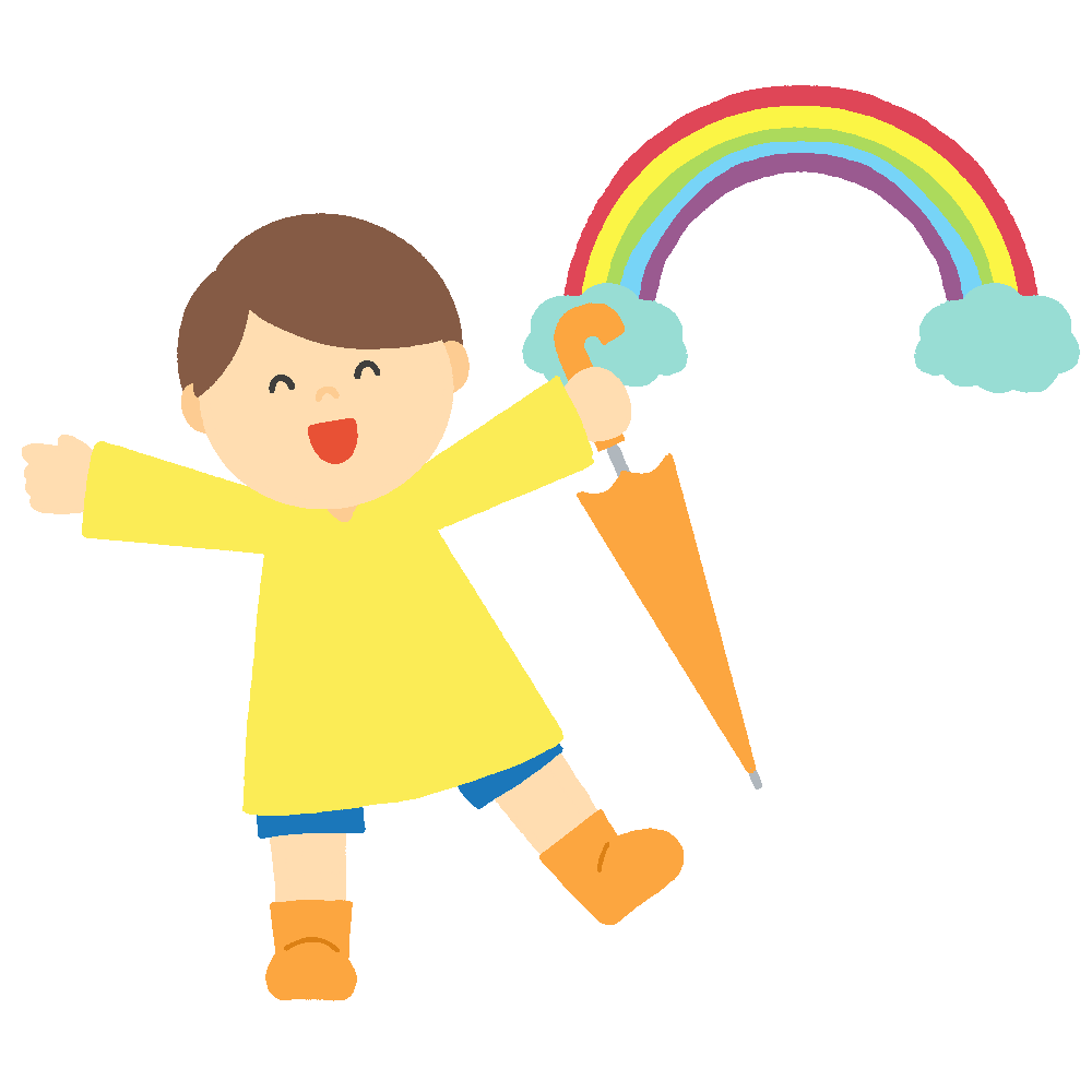 雨があがって晴れて虹が出て喜ぶ男の子の無料イラスト素材です。梅雨明けのイラストにも。