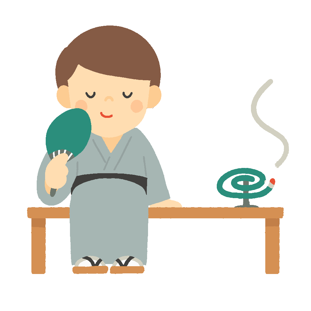 縁台に腰かけて夕涼みをする浴衣姿の男性と蚊取り線香の無料イラスト素材です。