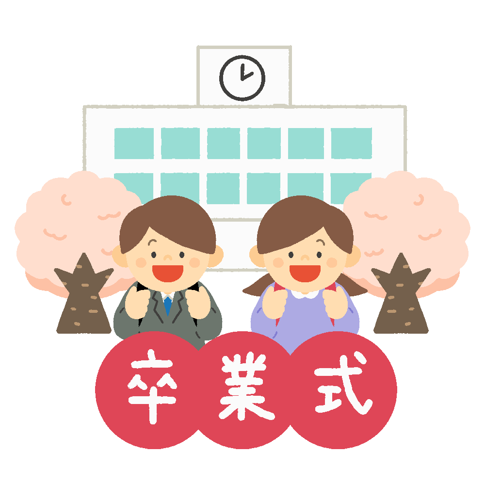 小学校の卒業式の文字の無料イラスト素材です。小学校とランドセルを背負った卒業生のイラストです。