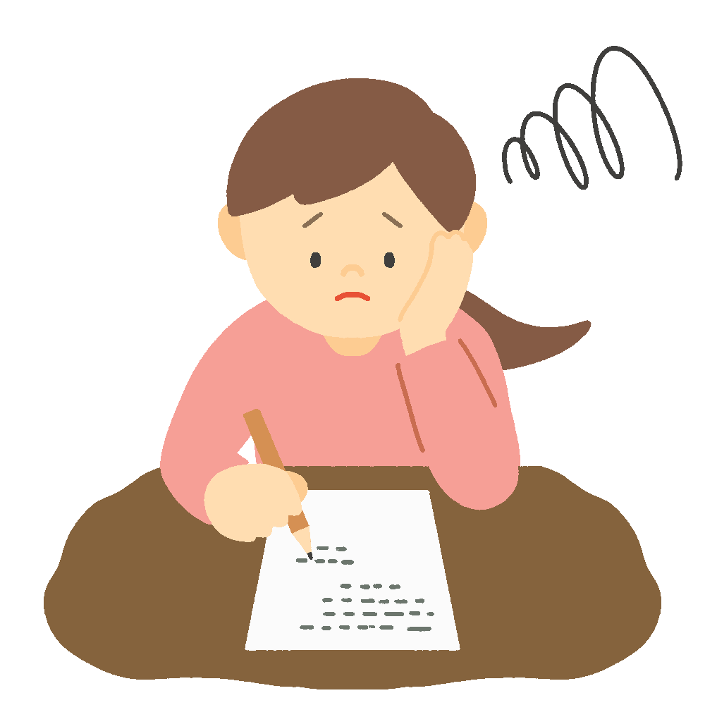 書類や手紙を書くことに頭を悩ませている女性の無料イラスト素材です。