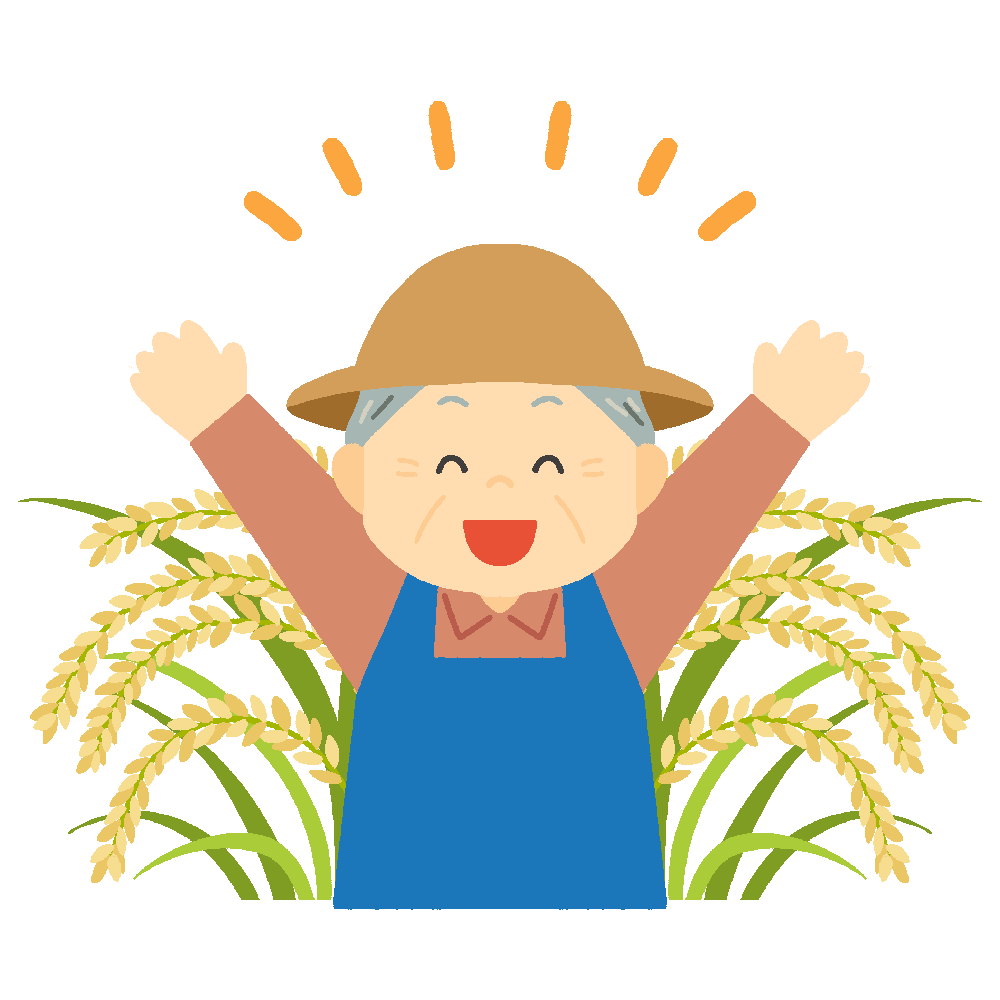 実りの秋、お米の豊作を笑顔で喜ぶ高齢の農家さんを描いた無料イラスト素材です。日本の農村風景や地域の知恵・経験を感じさせる温かみのある人物イラストで、食育教材、農業紹介、学校の授業などに。