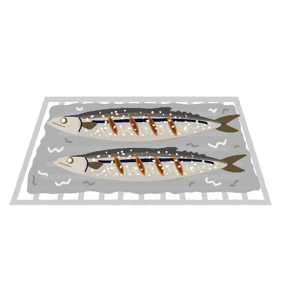秋の味覚「サンマ(秋刀魚)」の塩焼きをアルミホイルの上で焼いている調理シーンを描いた無料イラスト素材です。焼き魚レシピ紹介や調理手順説明などに。