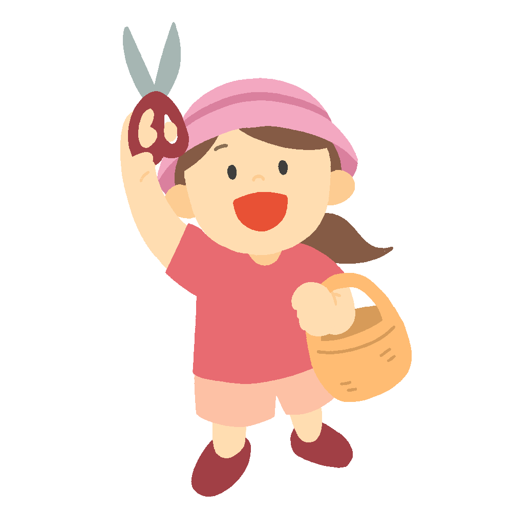 果物の枝をはさみで切り取りながら収穫を楽しむ女の子を描いた無料イラスト素材です。ぶどう狩りや梨狩り、みかん狩りなどの果物狩り体験、秋の味覚イベント、親子での農業体験、観光農園の紹介などに。