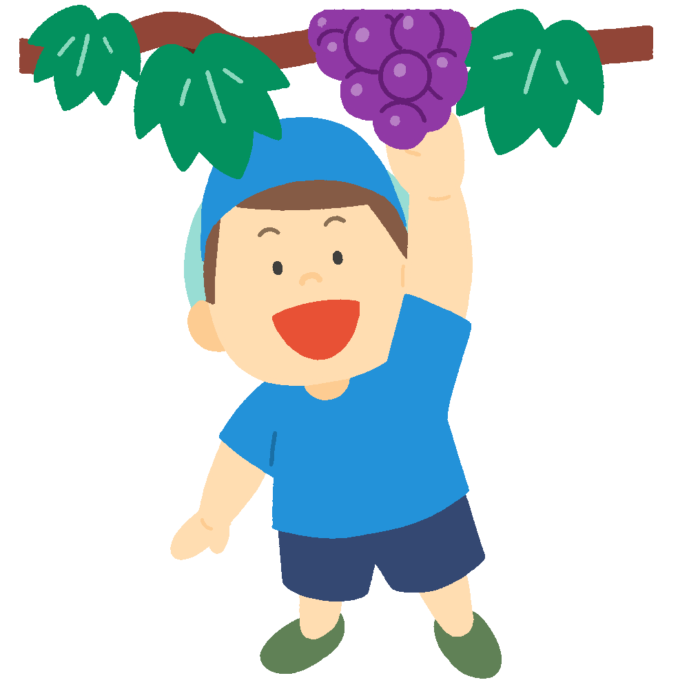 ぶどう狩りをしている男の子を描いた無料イラスト素材です。秋の味覚イベント、果物狩り体験、観光農園の紹介、家族でのレジャー、食育や農業体験のシーンに。
