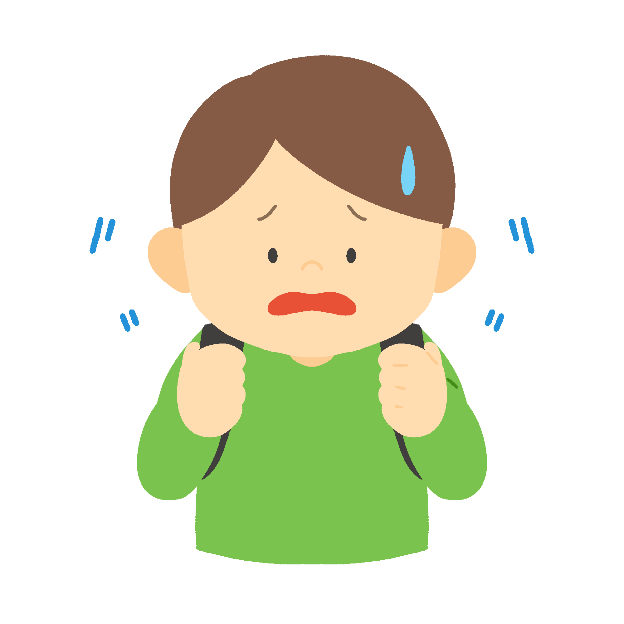 学校生活や不登校・いじめに関するコンテンツ、子どもの心理や感情をテーマにした資料、教育関連のコラム、学校の掲示物などに使える、学校に行きたくないランドセルを背負っている男の子の無料イラスト素材です。
