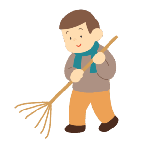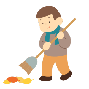 ほうきを使って地面を掃除している人を描いた無料イラスト素材です。秋の落ち葉掃きや学校・地域での清掃活動を紹介するシーンに。