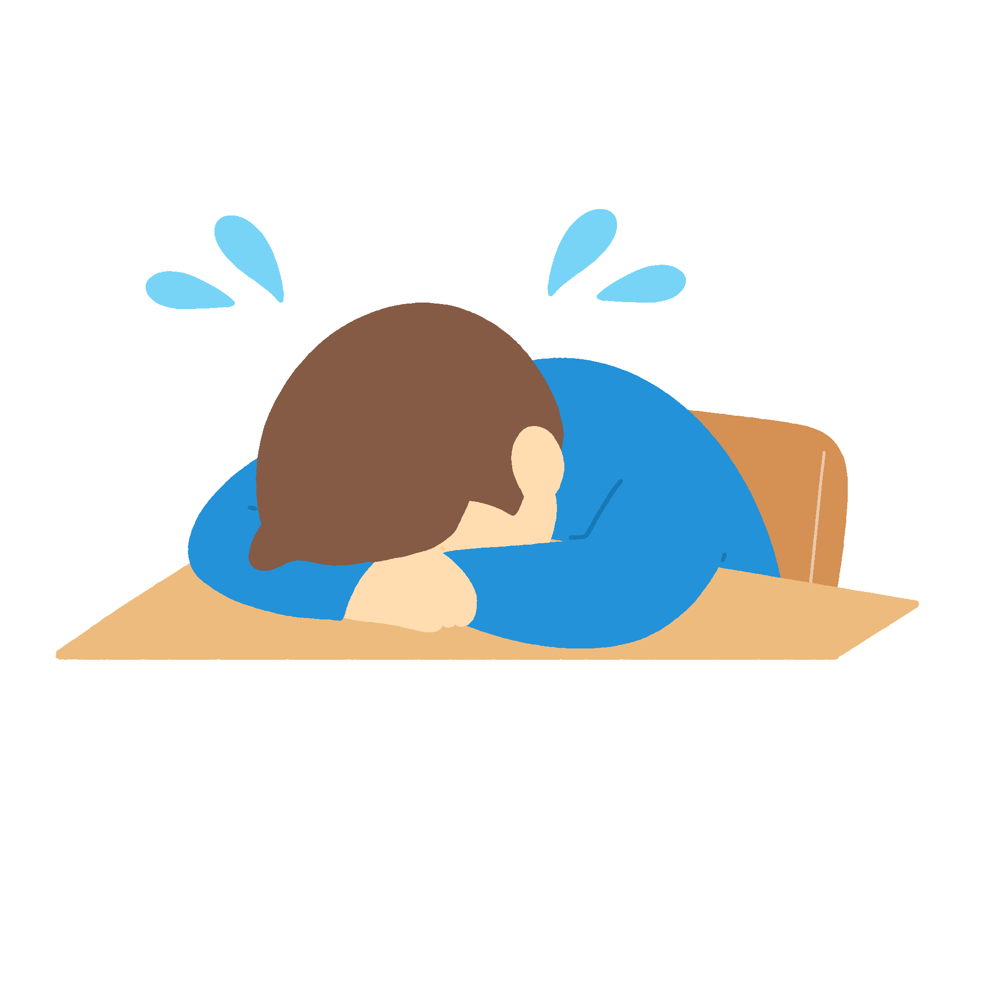 机に顔をうずめて涙を流す男性の無料イラスト素材です。失敗して落ち込む場面やショックを受けたシーン、学校や職場のストレス、挫折に。