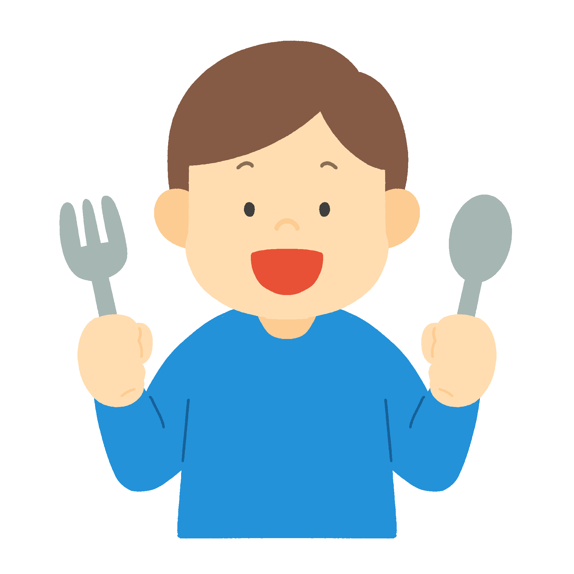 ごはんをおいしそうに食べる男の子の無料イラスト素材です。ランチやディナー、家庭の食卓、学校の給食、外食シーンなどさまざまな場面に。