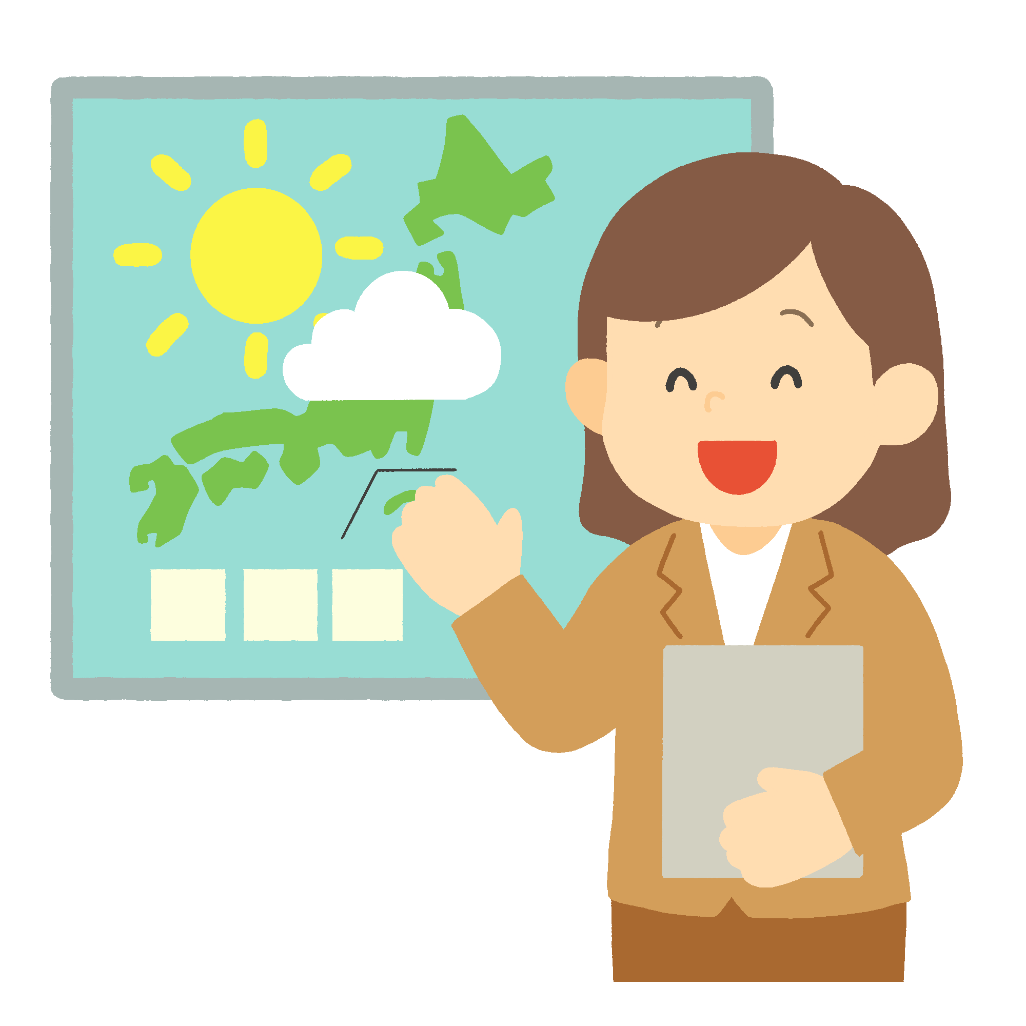 天気予報とお天気キャスターのイラスト 2025 11/04 イラスト 人物 天気 職業 FREE DOWNLOAD / この素材をダウンロードする テレビの天気予報を伝えるお天気キャスターと天気マークを描いた無料イラスト素材です。ニュース番組、天気コーナーに。気象予報士のイラストとしても。 使用方法 「てがキラ」の素材は、すべてリンクフリー・クレジット表記なしで利用していただくことができます。 ご利用前に必ず利用規約をご確認ください。 関連するイラスト素材 綿花摘みをする女性のイラスト 中国の宦官・宮廷官僚のイラスト ホテルマンのイラスト 警察官(ホイッスル)のイラスト イラスト 人物 天気 職業 シェアしてくれたらうれしいです URLをコピーしました! URLをコピーしました! カルタを取ろうとしている女の子のイラスト 市役所の建物のイラスト このイラストに関連する言葉から探す 人物, 職業, 天気 他のイラストを検索する リクエストする イラストのリクエストをする