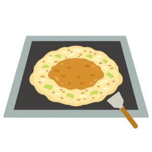 お好み焼きの無料イラスト素材です。屋台グルメや関西の食文化紹介、夏祭りや学園祭のシーンに。