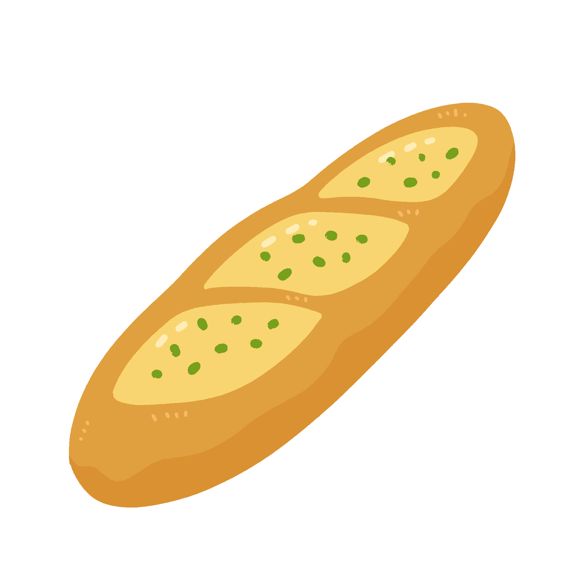 フランスパンにガーリックバター(にんにくバター)をたっぷり塗った「ガーリックフランス」の無料イラスト素材です。パン屋さんのおすすめ紹介や、ベーカリー・カフェのメニュー表、朝食・ランチのパン特集などのシーンに。