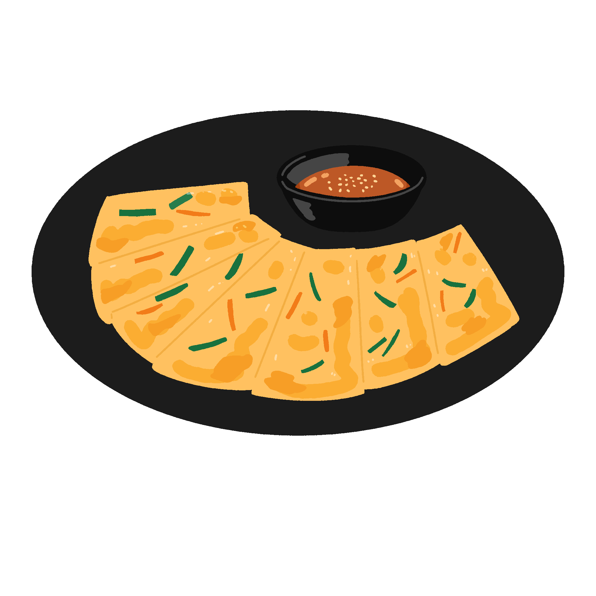 チヂミの無料イラスト素材です。韓国料理の定番、野菜やキムチ、海鮮などを入れて焼いたお好み焼きのようなチヂミのイラストです。背景透過。