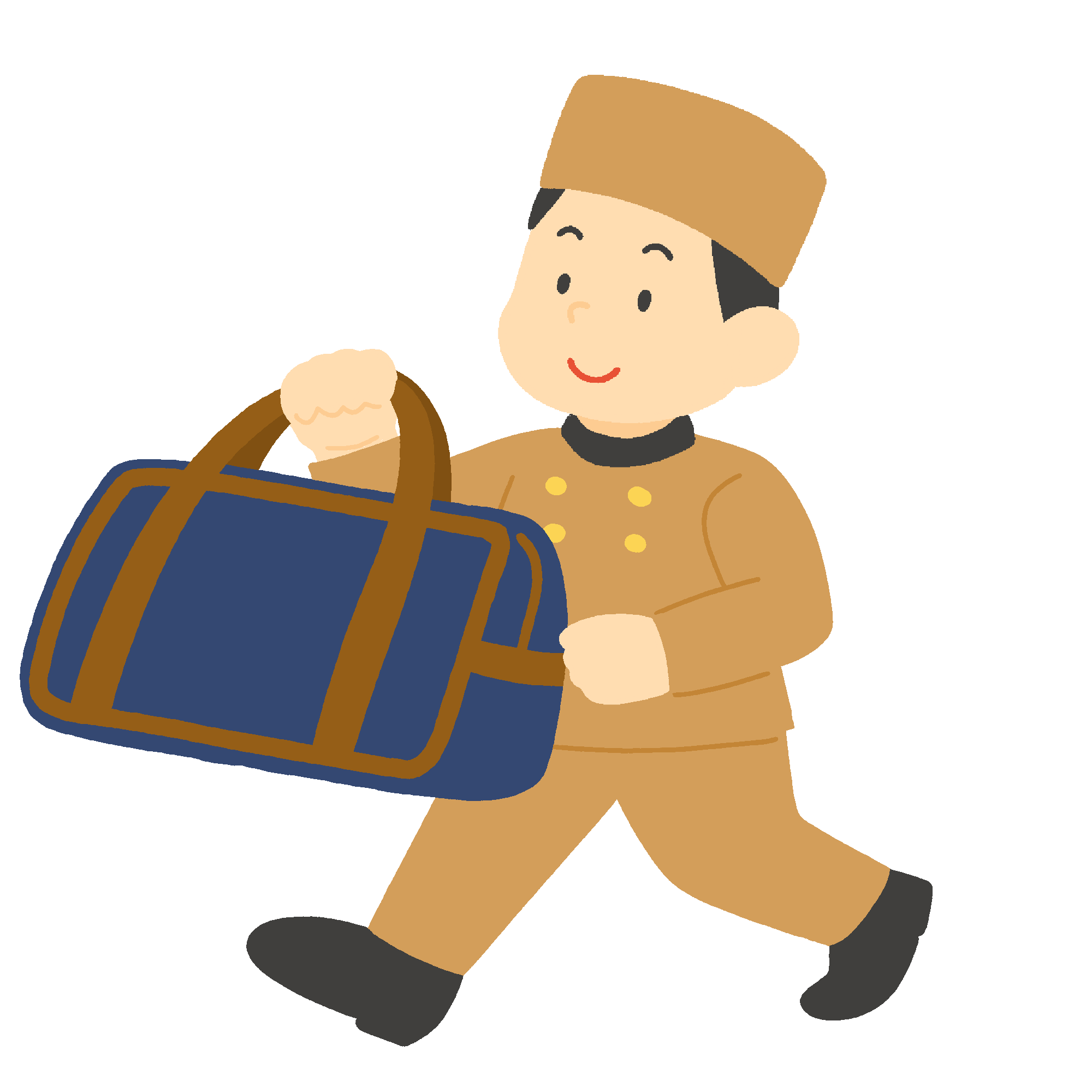 ボストンバッグを運ぶホテルマンの無料イラスト素材です。宿泊施設で荷物を持ち運ぶスタッフです。ホテルや旅館などの宿泊業、観光業、接客サービスのテーマなどにご利用いただけます。背景透過。