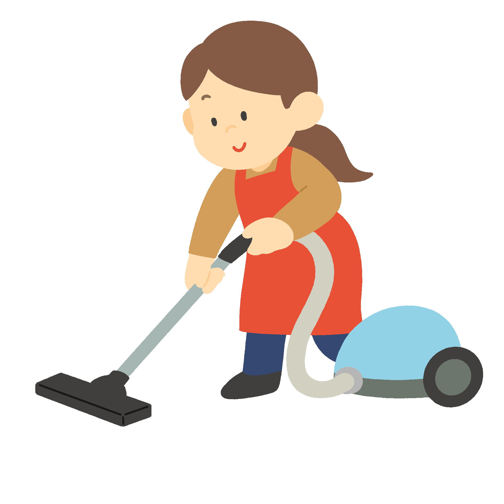 紙パック式掃除機をかける人の無料イラスト素材です。リビングや部屋の床を掃除機で掃除している様子を手描きで表現しました。家事のシーンや大掃除の場面などにご利用いただけます。背景透過。
