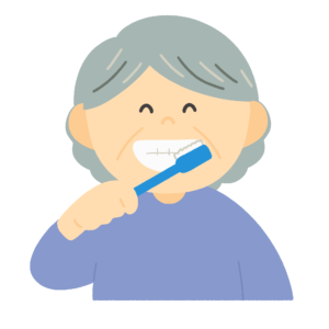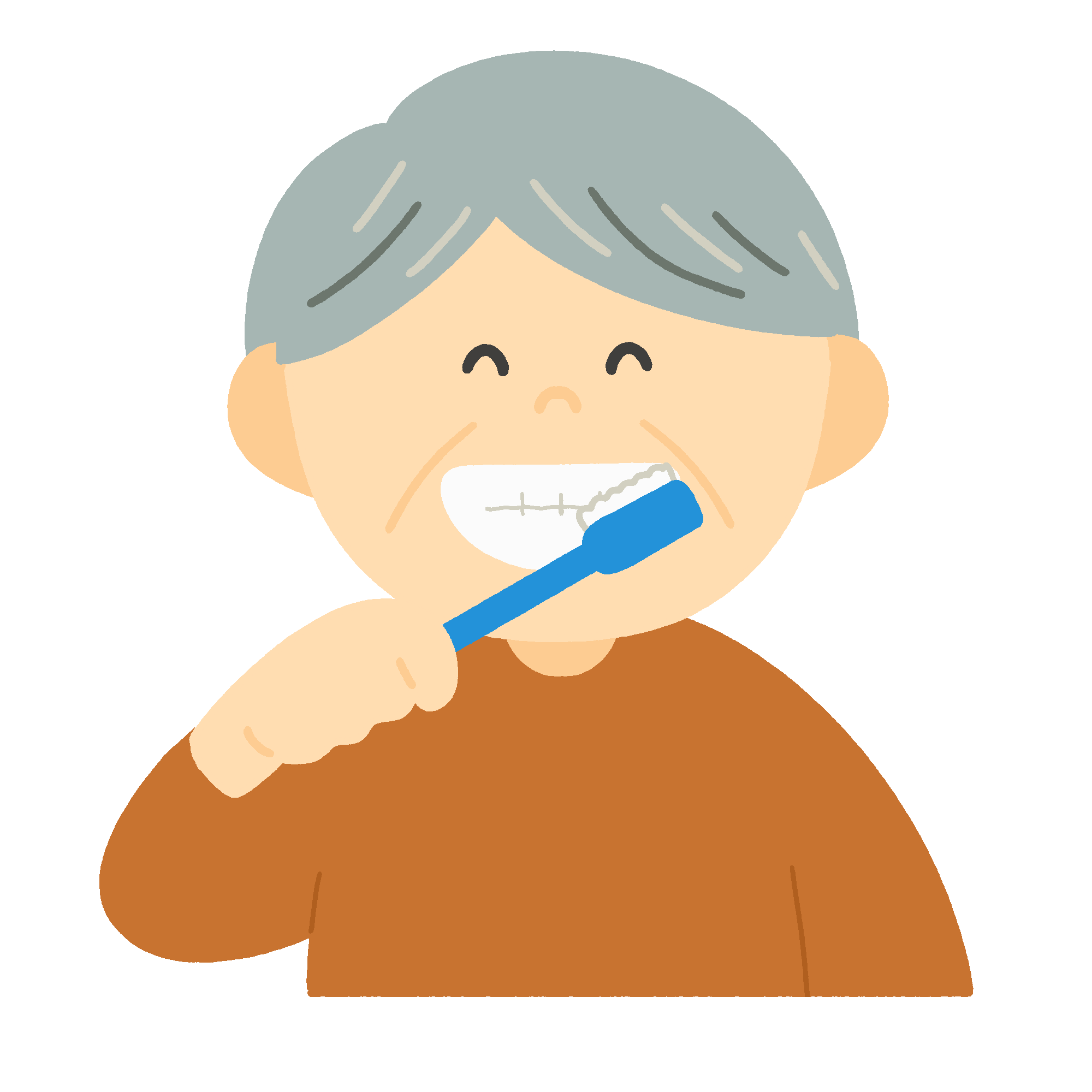 歯磨きをするおじいさんの無料イラスト素材です。歯ブラシを持って歯を磨くおじいさんのイラストです。保健だより・歯科だより・健康だより・口腔ケアの啓発資料・健康教室の案内などにご活用いただけます。背景透過。