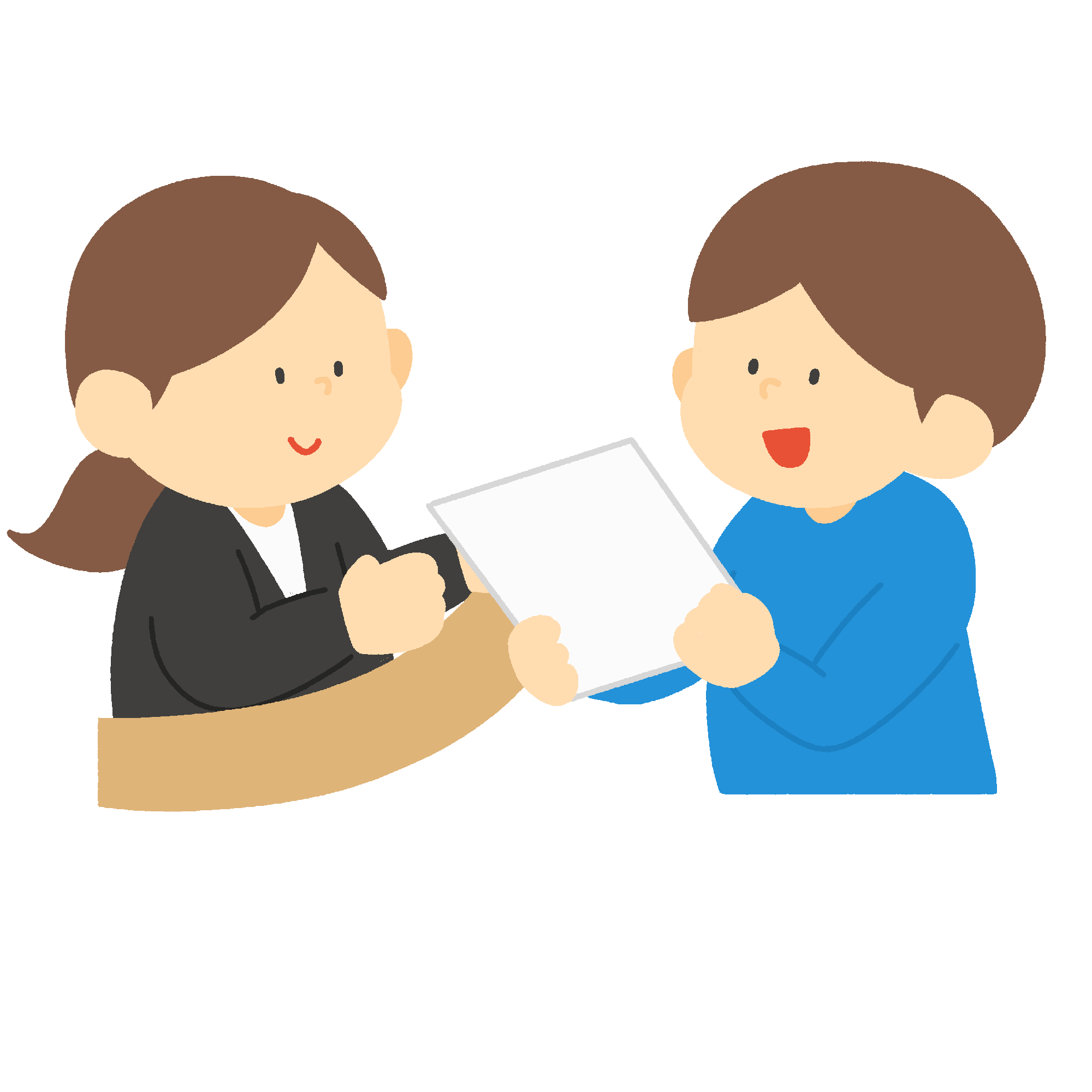 窓口に書類を出す人の無料イラスト素材です。役所や区役所、市役所などの行政窓口、銀行窓口、病院の受付などで申請書類や届出書類を提出する場面で使えます。住民票申請、転入届、確定申告、証明書の申請といった手続き、窓口業務、市民向けガイドなどに最適です。背景透過。
