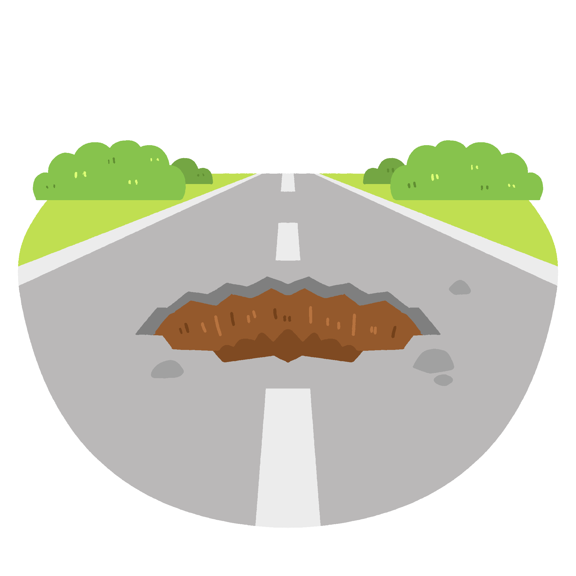 陥没した道路の無料イラスト素材です。道路に穴が開いた状態、アスファルトが崩れた様子など、道路の陥没・損傷を表現したイラストです。工事現場の注意喚起、道路の老朽化のシーンなどにご利用いただけます。背景透過。