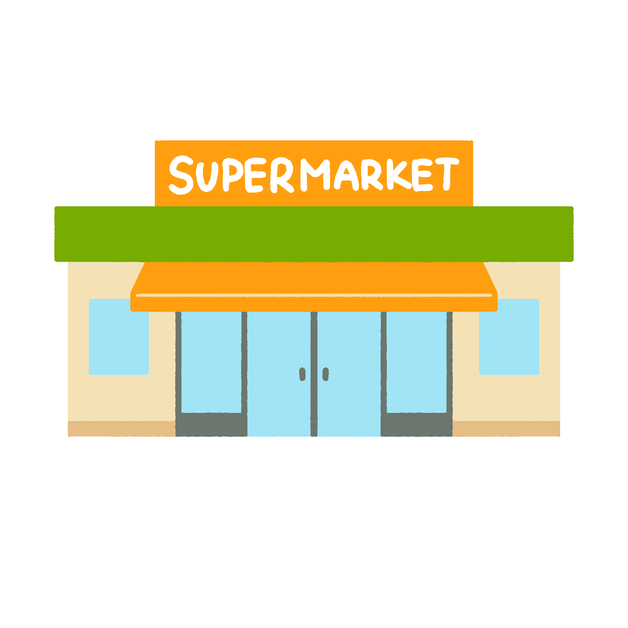 スーパーマーケットの無料イラスト素材です。食料品や日用品を販売する店舗の建物イラストです。背景透過。