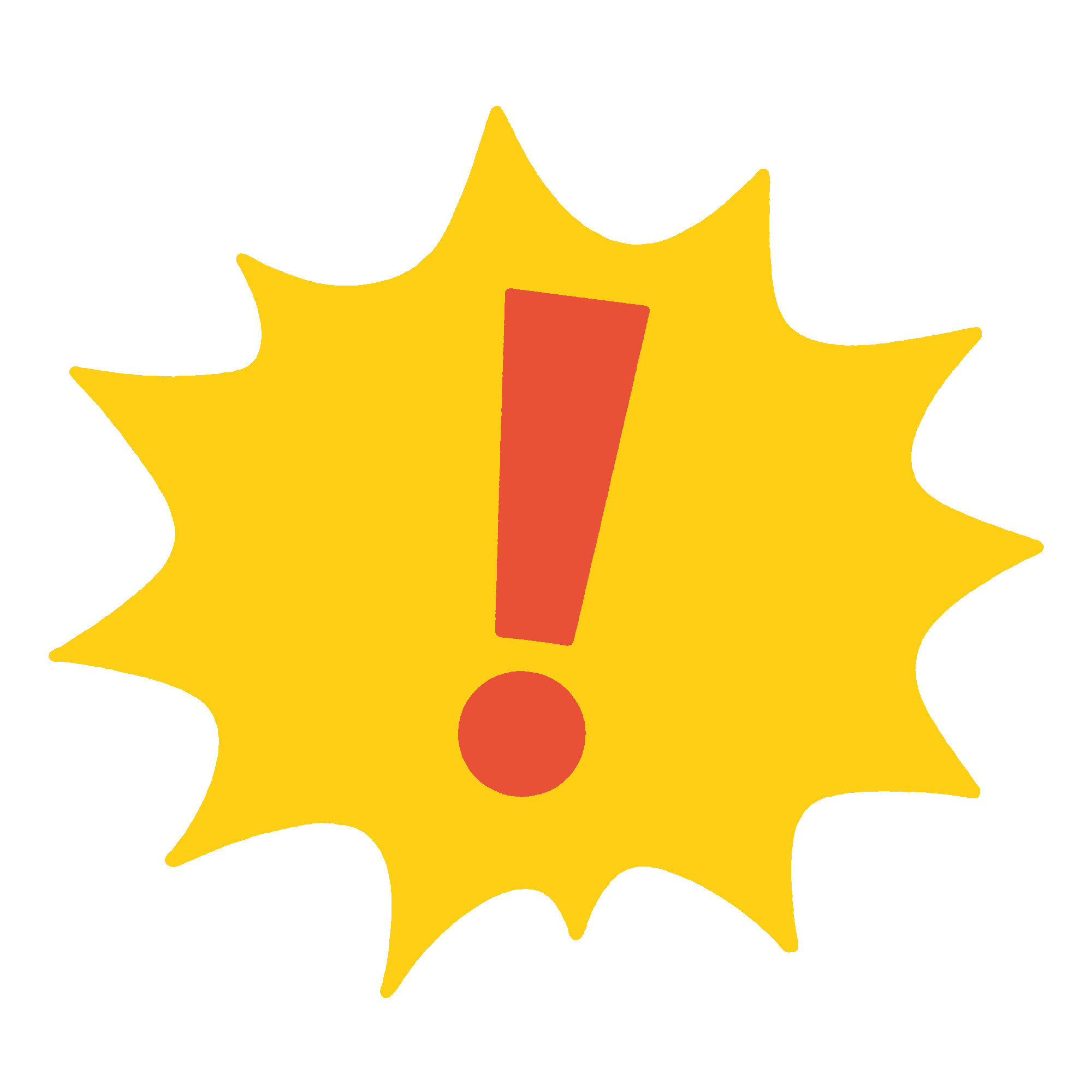 ぎざぎざの吹き出しに入ったビックリマーク(エクスクラメーションマーク)の無料イラスト素材です。驚きや衝撃、注意喚起を表現するのに便利です。お知らせやポスター、プリント、資料作成などにご活用ください。背景透過。