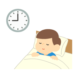 早く寝る男の子の無料イラスト素材です。就寝時間を守り早めにベッドや布団に入る子どもの様子を表したイラストで、睡眠習慣・生活リズムの啓発に役立ちます。背景透過…