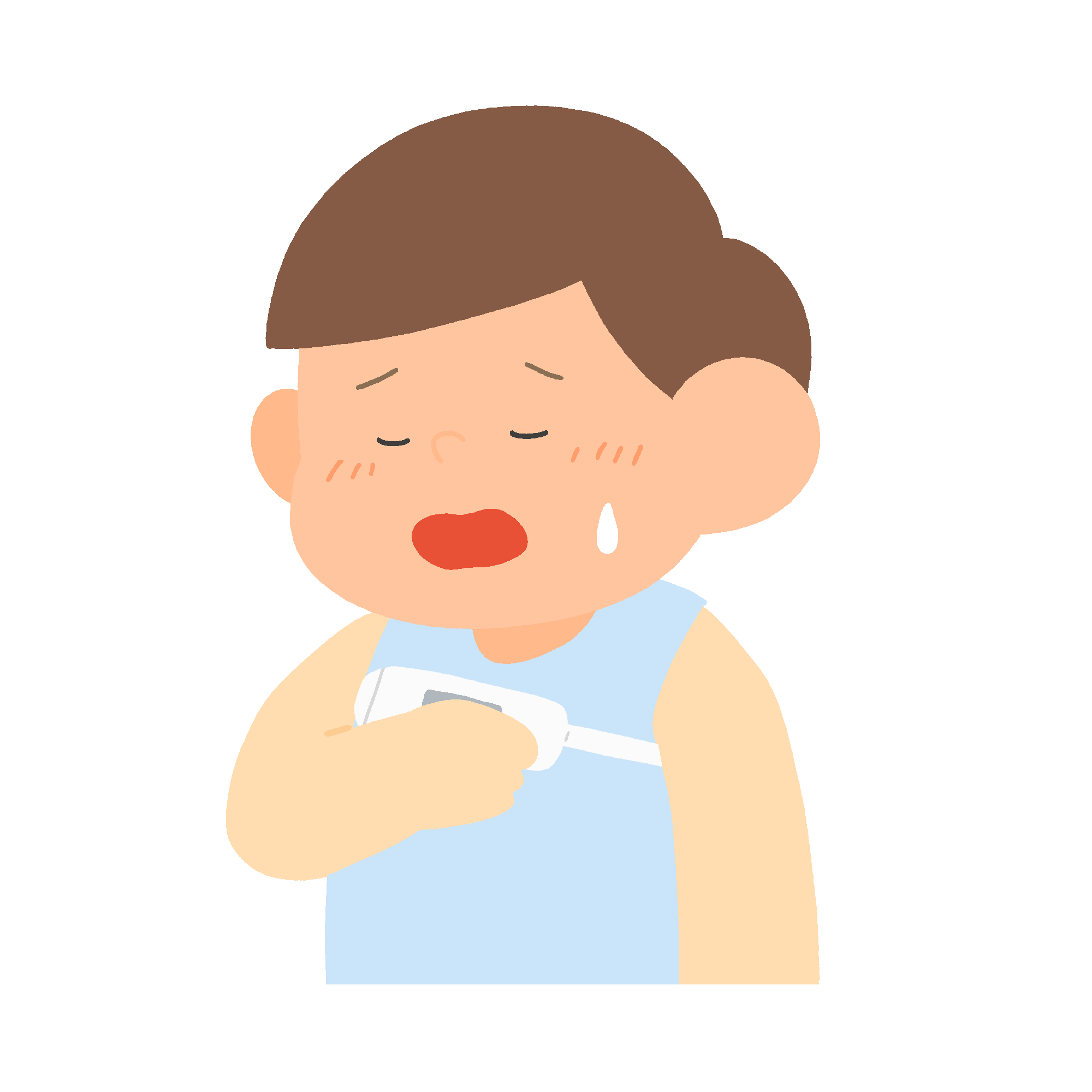 体温計で検温する男の子(発熱)の無料イラスト素材です。つらそうな表情で体温計を当てる様子を描いたイラストで、発熱・体調不良のシーンに使いやすい素材です。学校の保健教材や医療・福祉系の資料制作にお役立てください。背景透過。商用利用可能です。