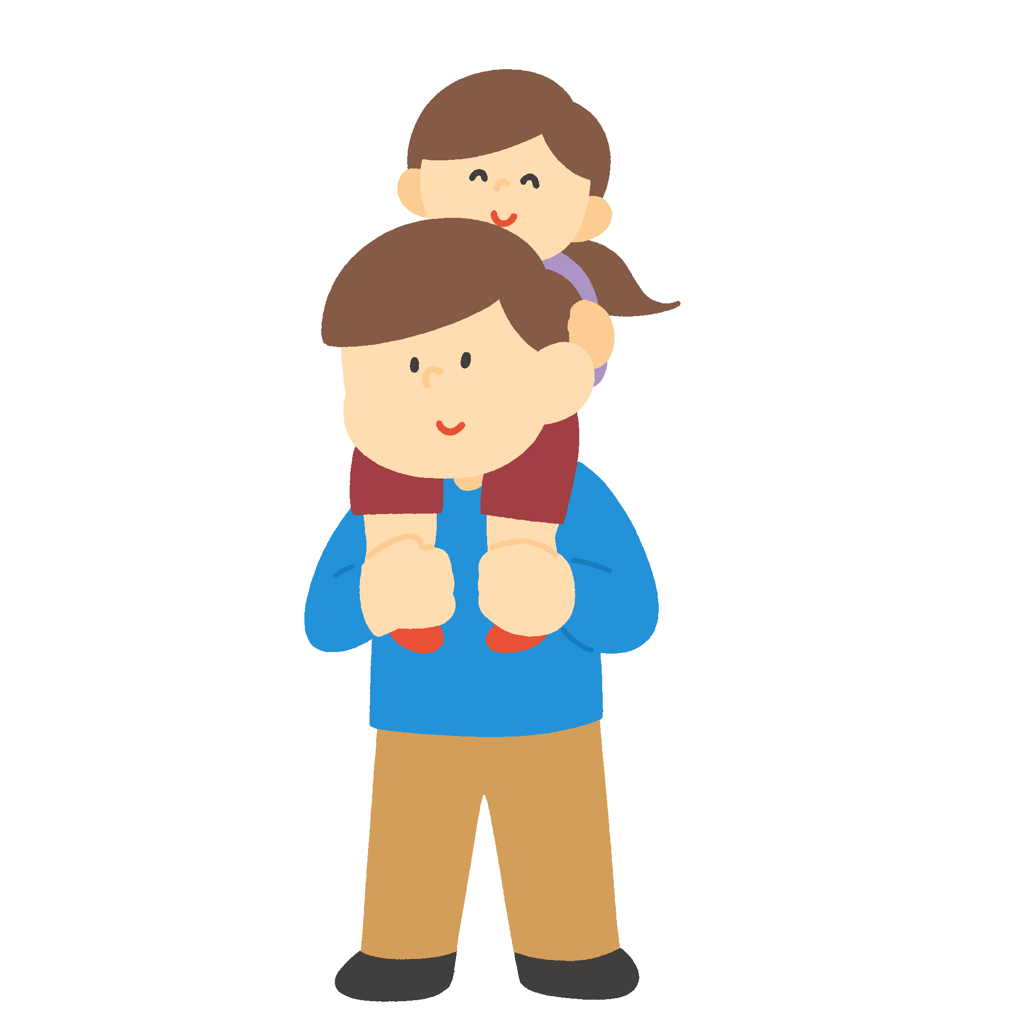 肩車する父親の無料イラスト素材です。子どもを肩に乗せた父親のほほえましいシーンを描いています。背景透過。商用利用可能です。子育て支援の資料や家族行事のポスター、保育・教育教材などにご使用いただけます。