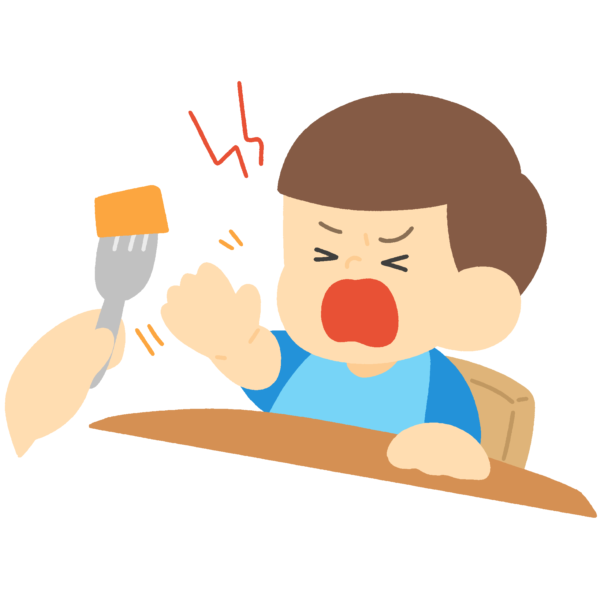 野菜を食べるのを嫌がる赤ちゃんの無料イラスト素材です。食べ物を前に嫌そうな表情をする乳幼児を描いたイラストで、離乳食や幼児食に関する育児情報、保健だよりの挿絵としてお使いいただけます。背景透過。商用利用可能です。子育て支援・食育啓発にも幅広く活用できます。