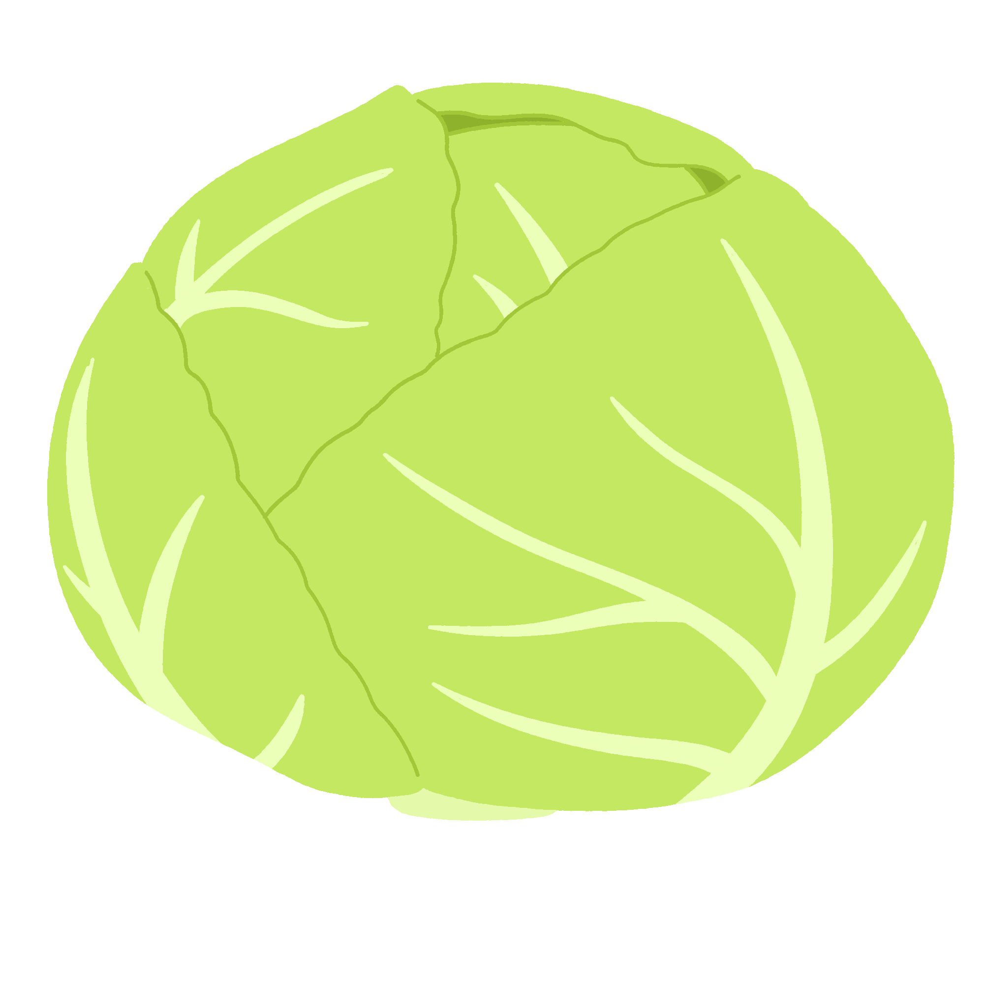 キャベツの無料イラスト素材です。丸ごとのキャベツを描いたカラーイラストで、給食だよりや食育プリントに幅広く使えます。背景透過。商用利用可能です。春キャベツ・新キャベツなど季節の食材紹介にもぴったりです。