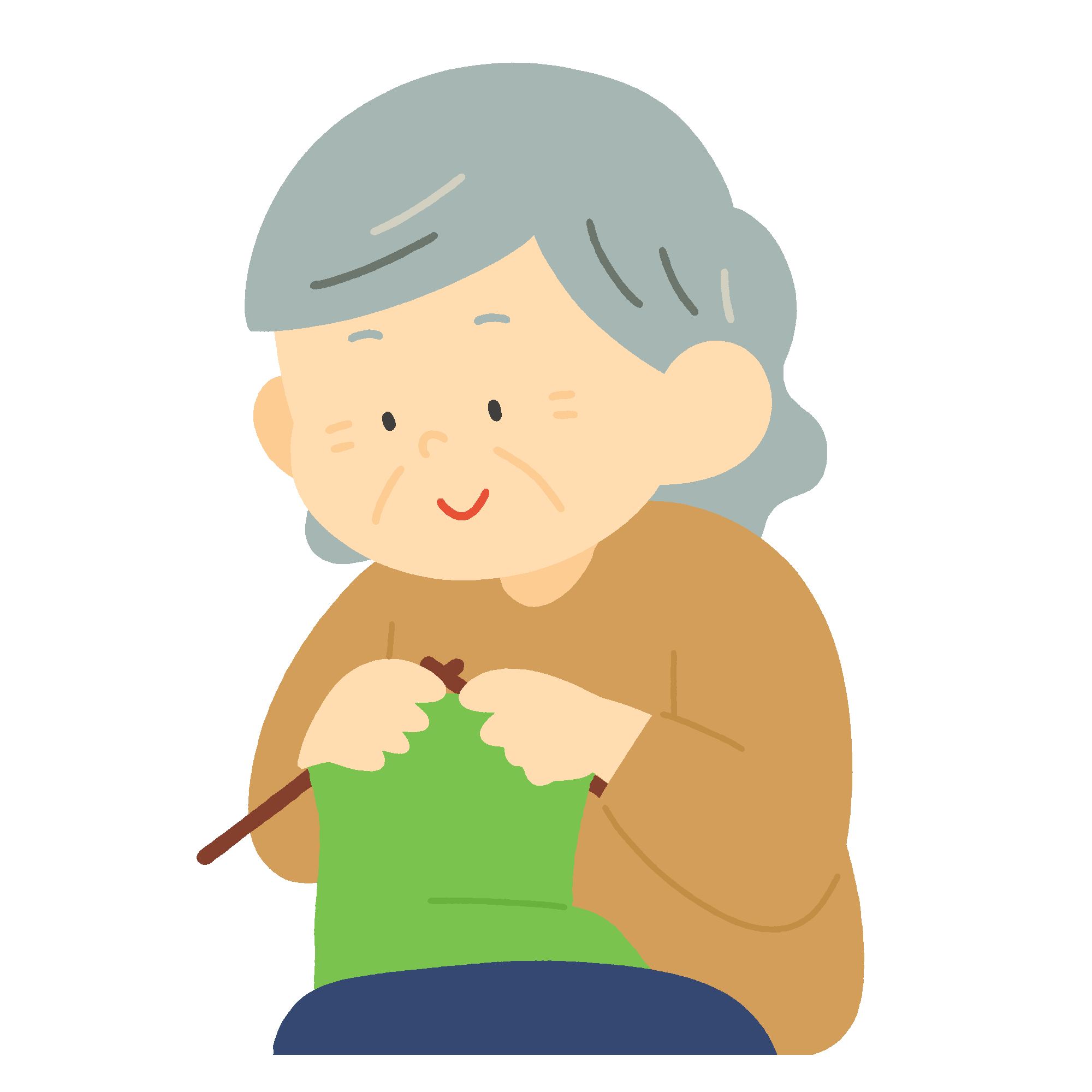 編み物をするおばあさんの無料イラスト素材です。毛糸と棒針で編み物を楽しむ高齢女性のイラストで、敬老の日の掲示物や介護・福祉施設の広報、シニアの趣味・生きがいを紹介する資料などにご活用いただけます。背景透過。商用利用可能です。