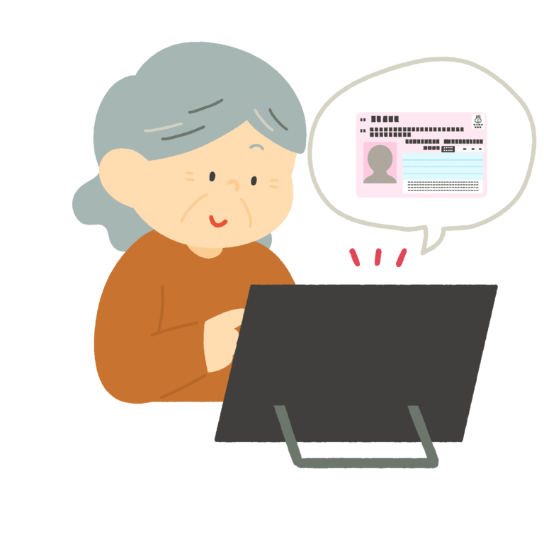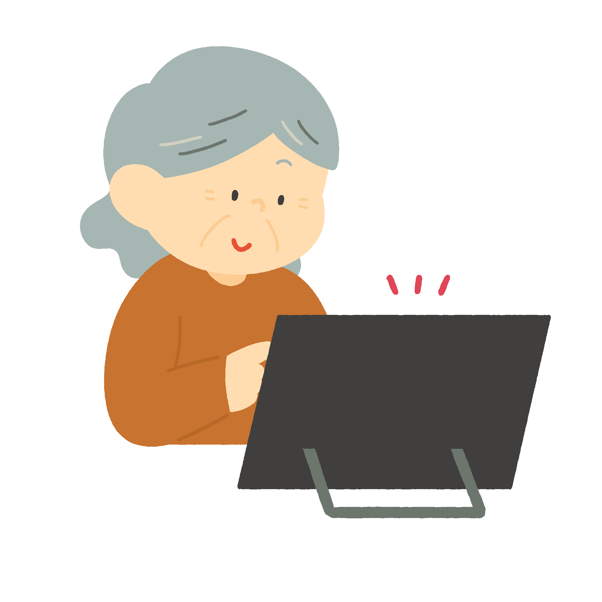 タブレットを操作するおばあさんの無料イラスト素材です。タブレット端末を使う高齢女性を描いたイラストで、デジタル活用支援やICT講座の案内、シニア向けの広報資料などにご活用いただけます。背景透過。商用利用可能です。行政窓口のDX推進資料にも。