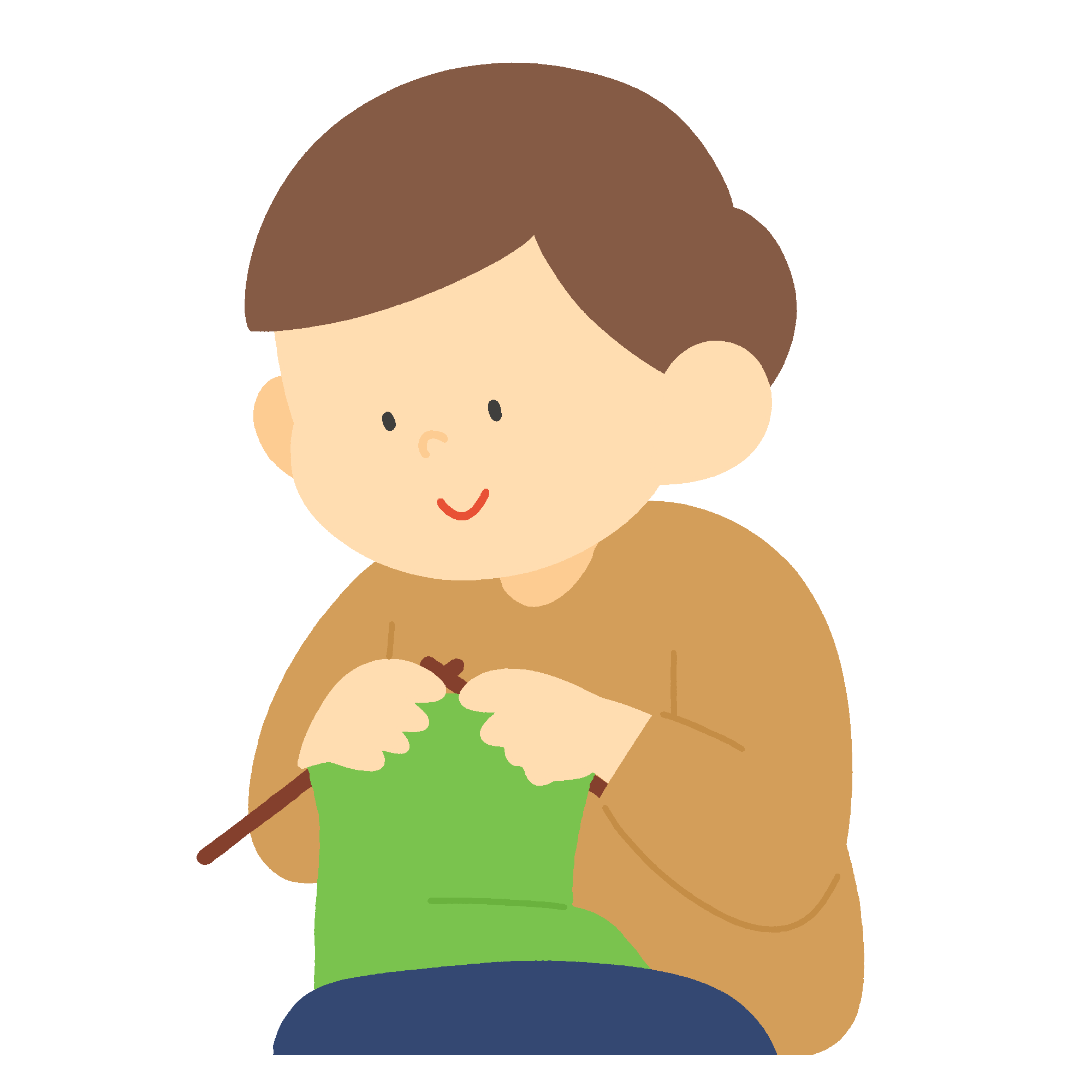 編み物をする男性の無料イラスト素材です。棒針で毛糸を編む男性のイラストで、性別にとらわれない趣味を表現した場面として、手芸教室の案内や広報誌の挿絵にご利用いただけます。背景透過。商用利用可能です。