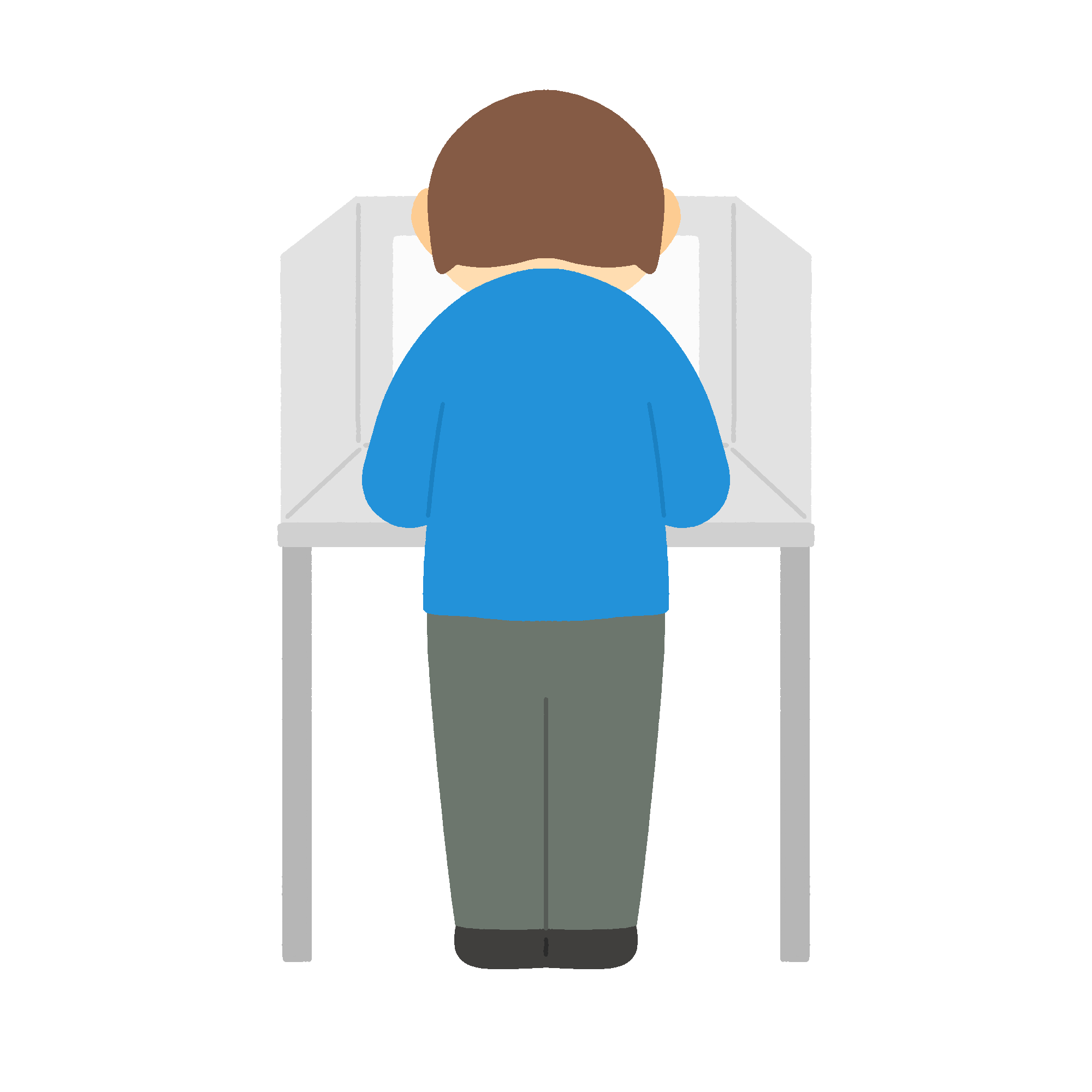 選挙の投票所の記入台で書く人の無料イラスト素材です(後ろ姿)。投票台で投票用紙に記入する有権者を後ろから描いたイラストで、主権者教育の資料や選挙管理委員会の啓発物、投票率向上を目的とした広報ポスターにご利用いただけます。背景透過。商用利用可能です。
