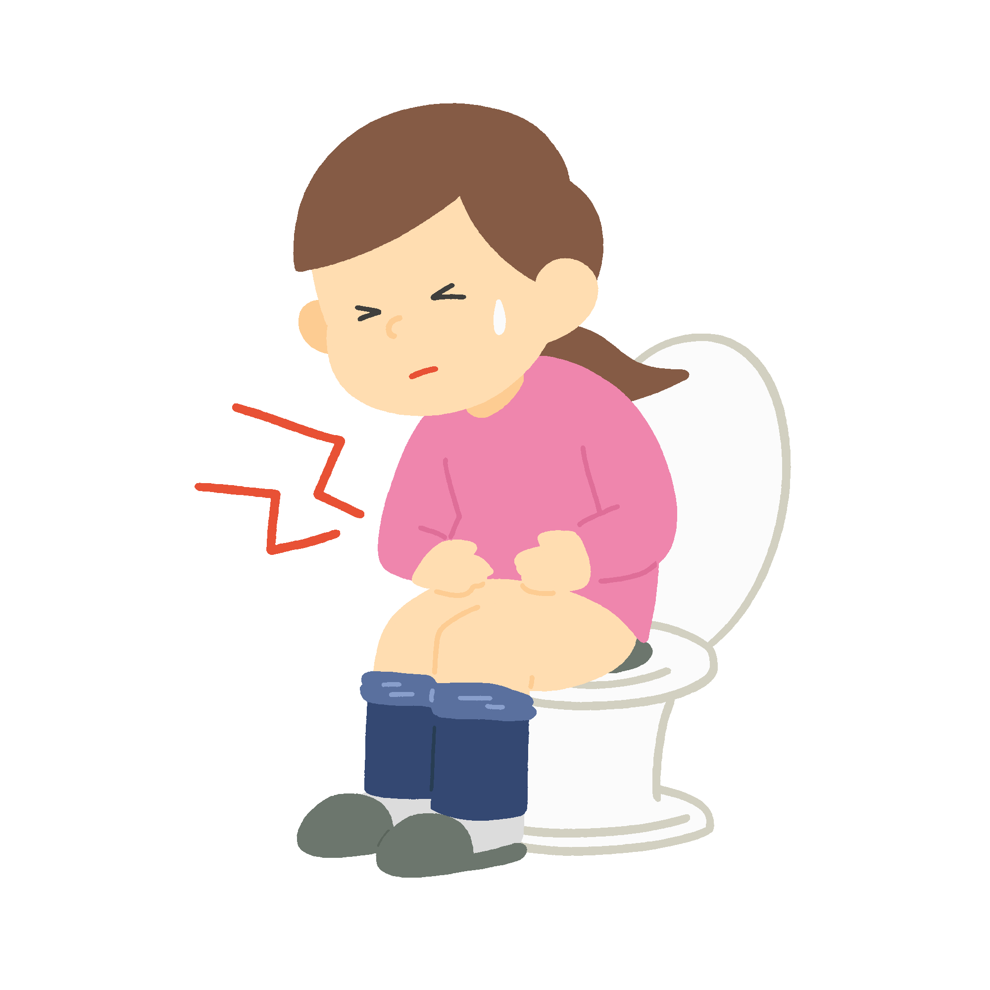 トイレでお腹を押さえる女性の無料イラスト素材です。腹痛や便秘・下痢などの消化器系の不調、生理痛を抱える女性の様子を表しており、健康啓発や医療機関のパンフレット、保健指導資料などの制作に適しています。背景透過。商用利用可能です。