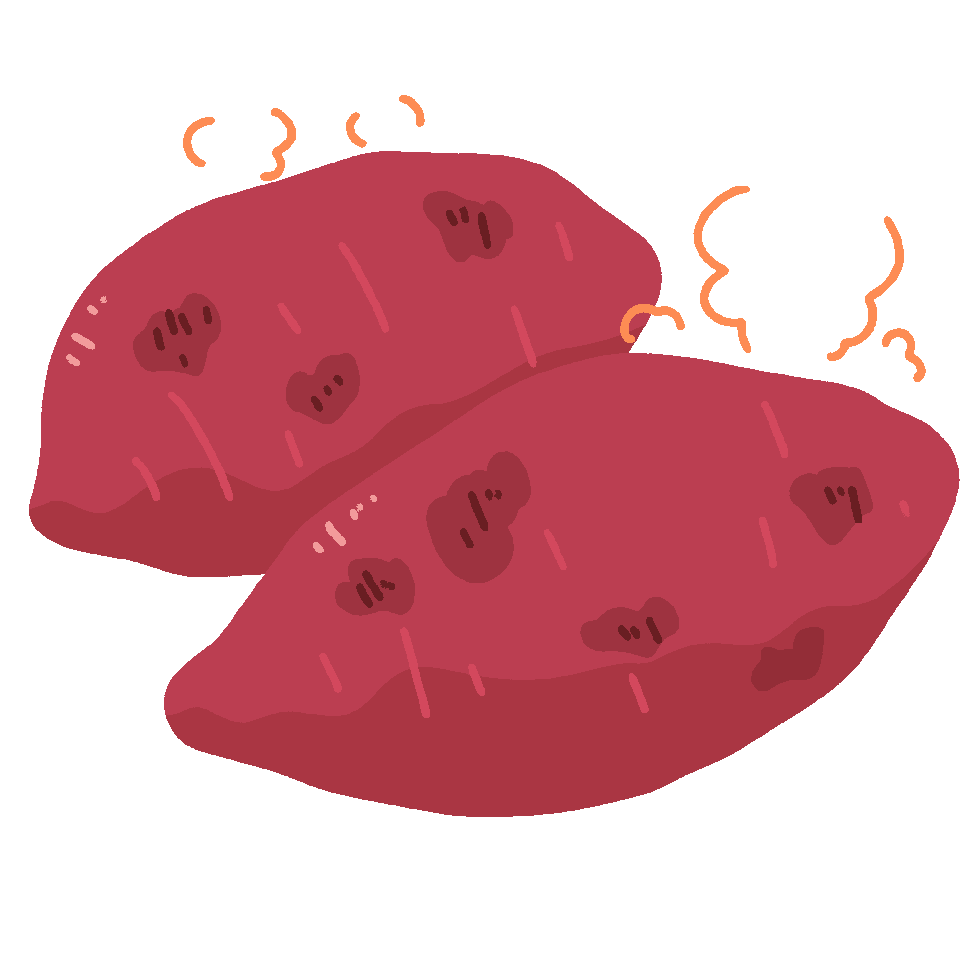 焼きいもの無料イラスト素材です。ほくほくと湯気が立つ秋の味覚をかわいらしく描いたカラーイラストです。背景透過。商用利用可能です。給食だよりや学級通信の挿し絵、秋の行事プリントや食育教材にぴったりの手描き風フリー素材です。