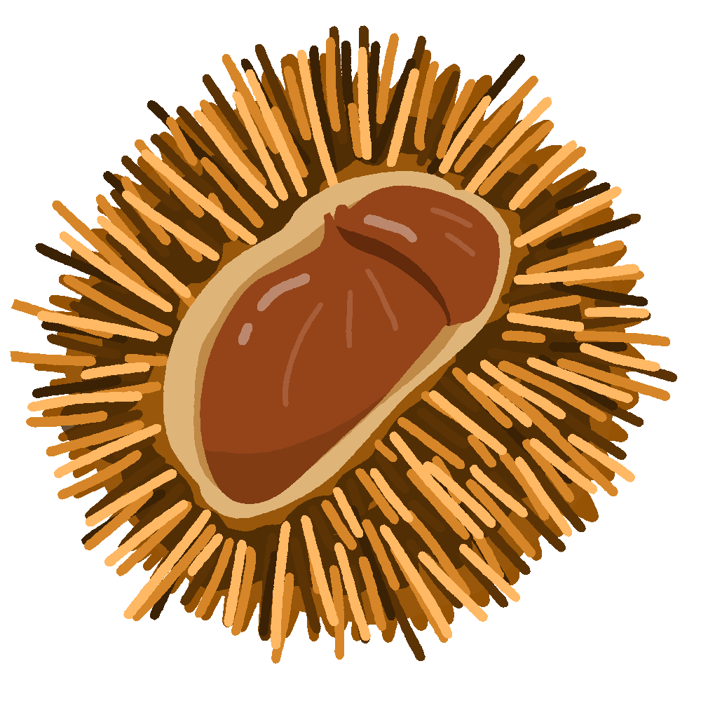 An illustration of a chestnut enclosed in its spiky burr, representing a typical autumn plant. Great for use in seasonal content, food blogs, educational materials, or fall-themed designs. Provided in a transparent PNG format for easy use in web and print projects.