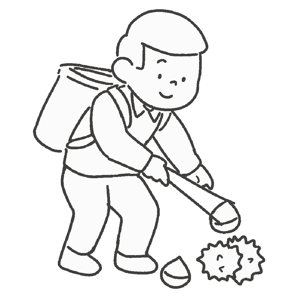 This free illustration features a black and white outline of a person collecting chestnuts, representing an autumn activity.