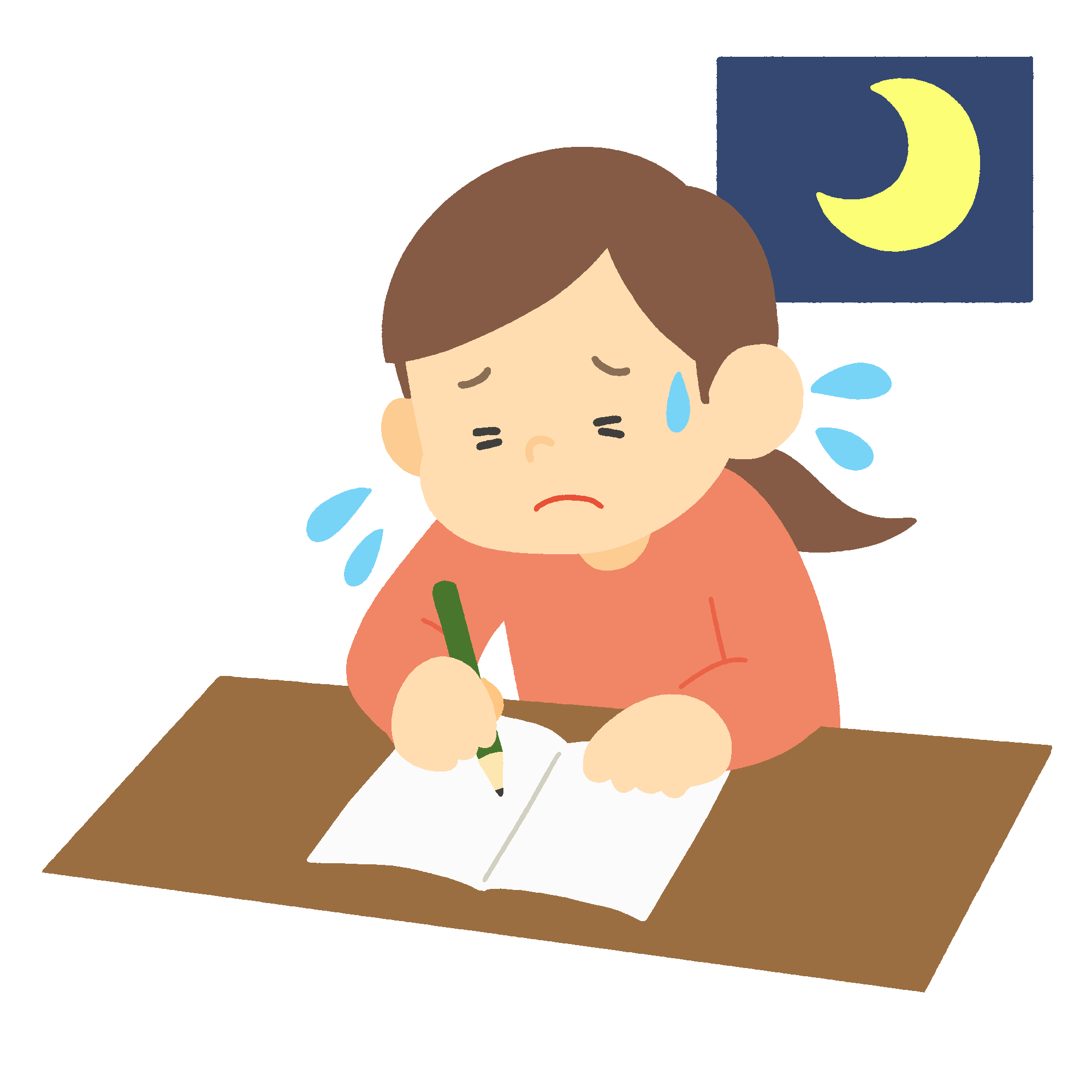 This is a free clip art of a woman studying at her desk until late at night. For the scene of studying for a test, studying for a qualification, studying for an examination, or studying for a test overnight.