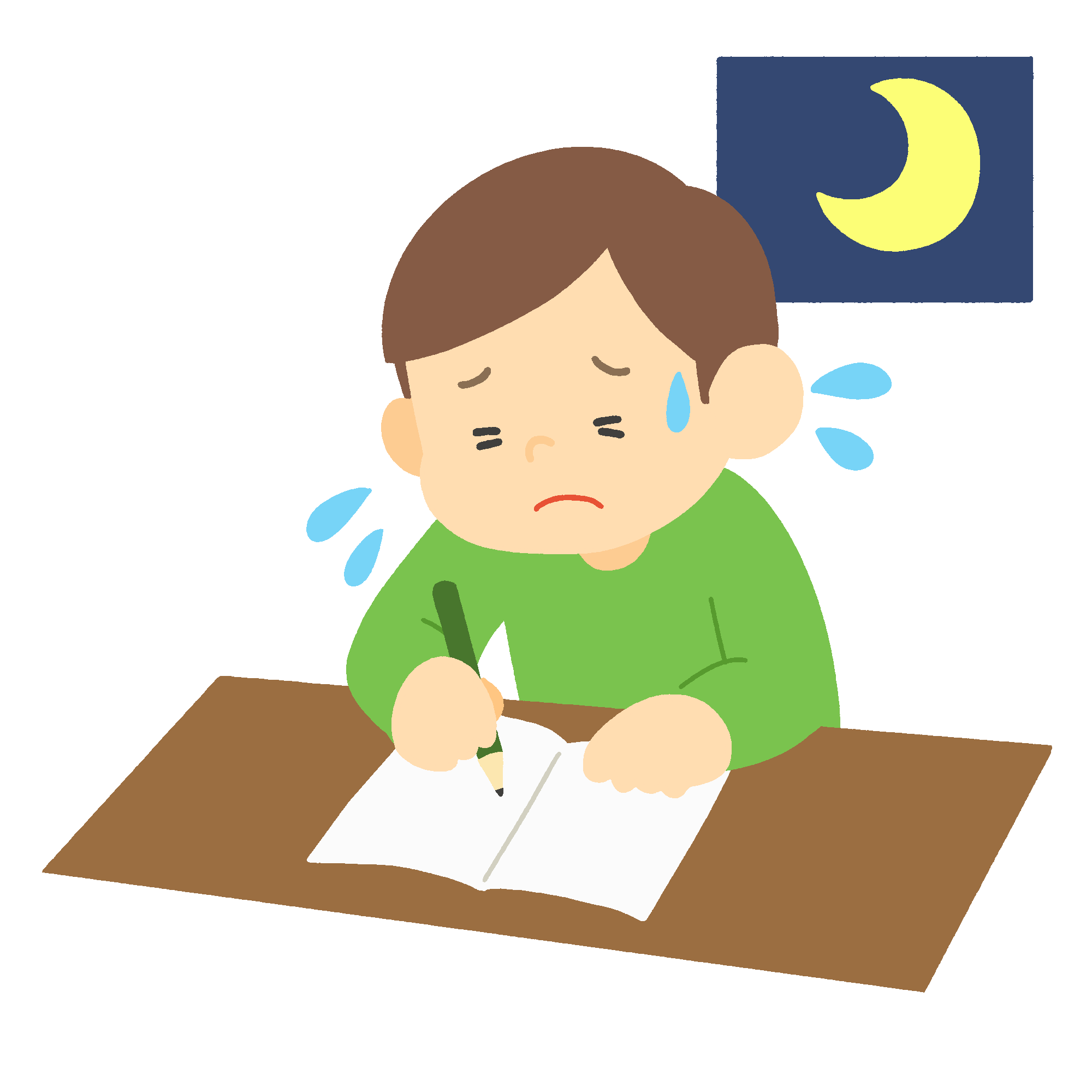 This is a free clip art of a man studying at his desk until late at night. For the scene of studying for a test, studying for a qualification, studying for an examination, or studying for a test overnight.