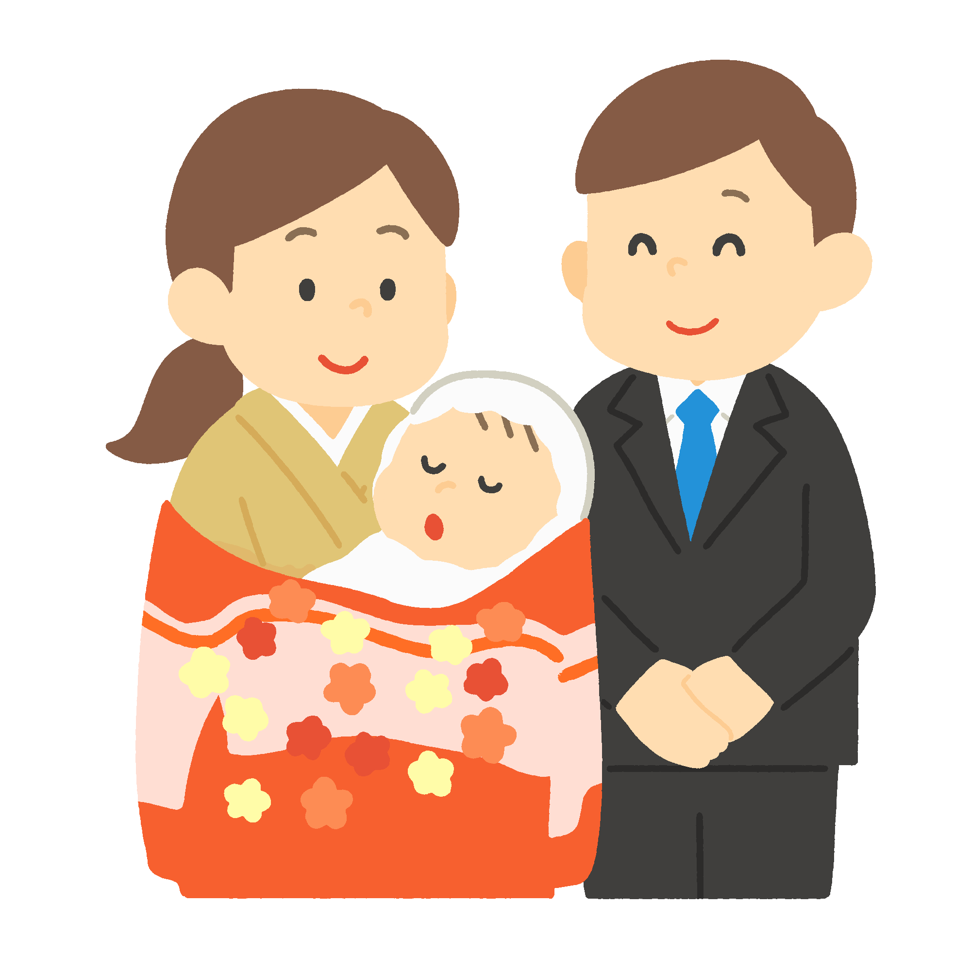 This is a free illustration of a baby wearing an ubugi (baby clothes) and a mother and father visiting the shrine for the first time. Transparent background.