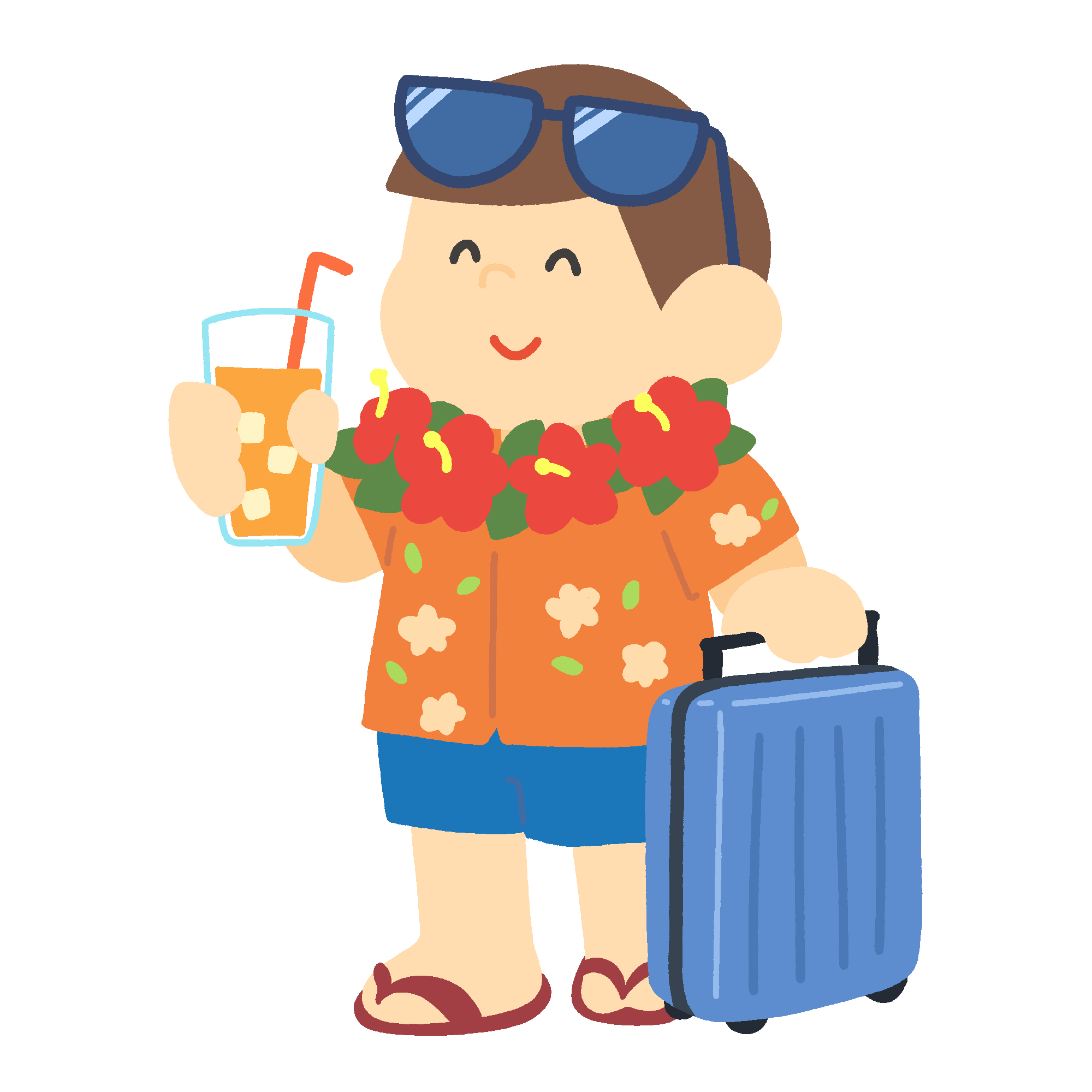 In this page, We offer the clip art of a man enjoying his vacation. In this clip art, a man is holding a tropical juice in his hand, wearing a hibiscus lei (necklace), an aloha shirt, a suitcase, and sunglasses on his head. This illustration can be used for summer vacation, Golden Week, travel-related, or vacation announcements. Transparent background.